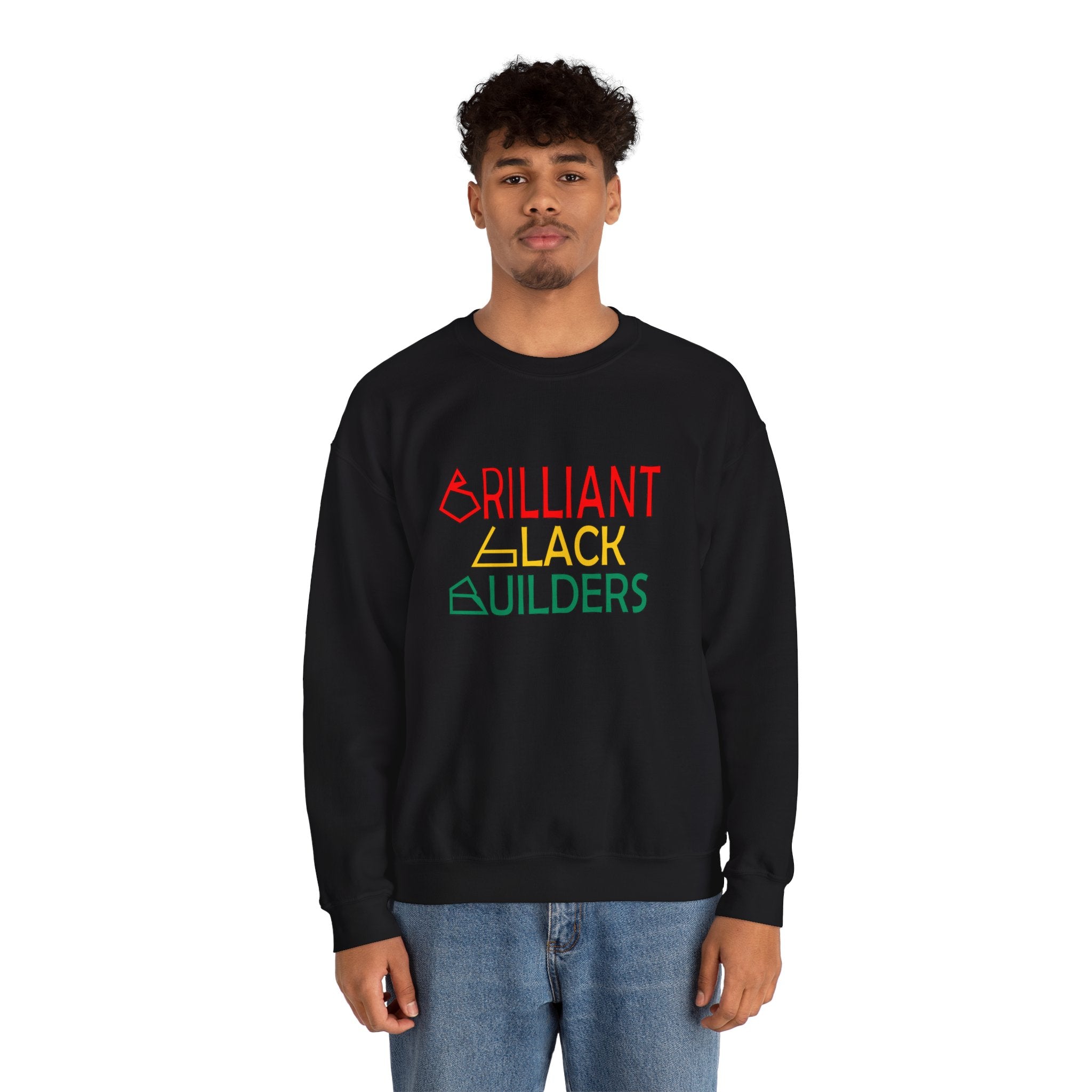 Soft, steady, and quietly bold — this crewneck frames a message of pride and progress without shouting. The black sweatshirt features a trio of geometric, Afrocentric-inspired letters in warm red, gold and green that spell out a confident phrase for makers, designers, and builders who celebrate Black talent. Wear it to studio sessions, community meetups, or neighborhood walks. It layers easily under a coat or over a tee, holding shape through long days and repeat washes. The embroidered-feel print sits centered and clear, so the words read like a statement you live by, not just a slogan.