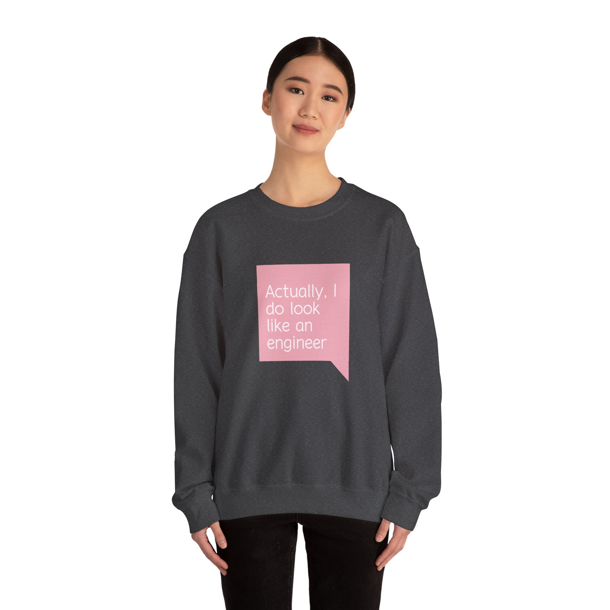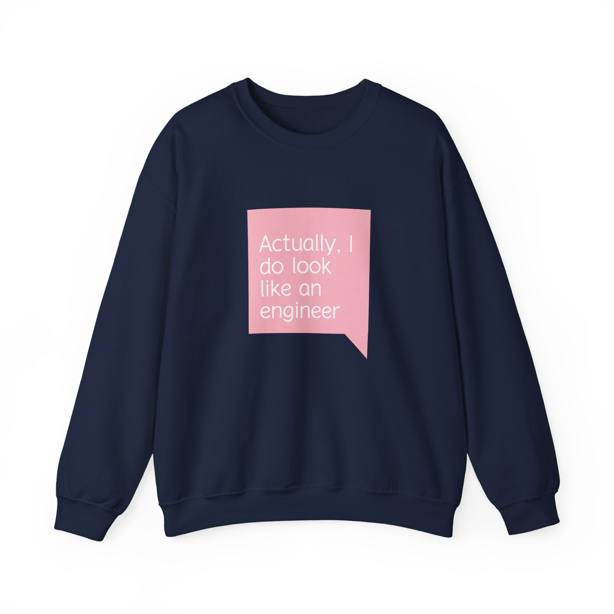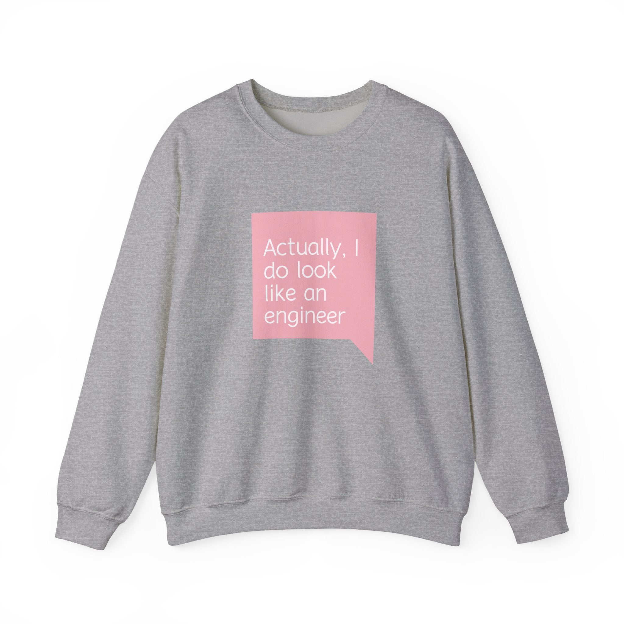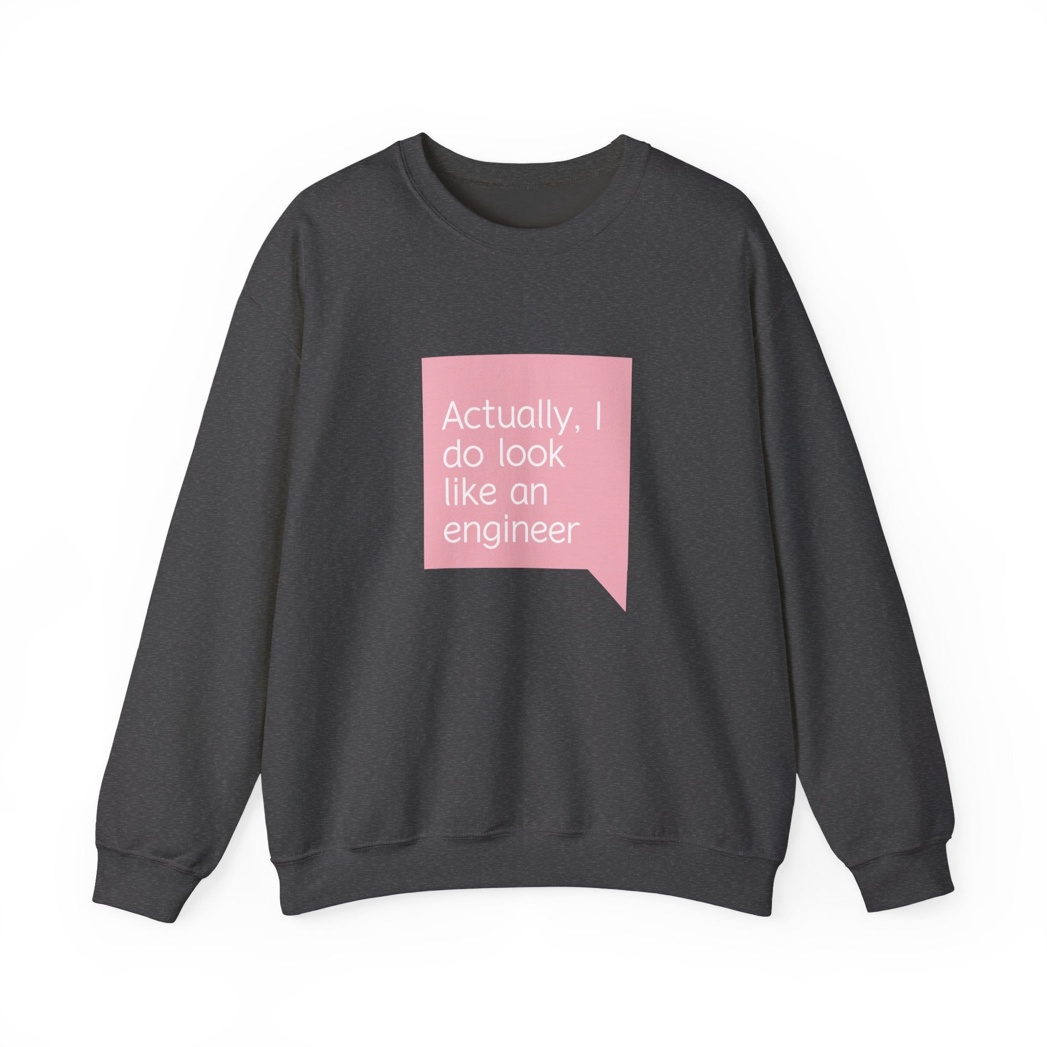 Do I really have to say it?? This is the perfect gift for the women in your life who still get comments like "you don't look like an engineer". This soft, cozy crewneck sweatshirt has a clean, confident statement: “Actually, I do look like an engineer.” Lighthearted and quietly proud, this piece sits comfortably between casual and clever — warm enough for late-night lab work, comfortable for campus walks, and smart enough for coffee-shop coding sessions. The medium-heavy 50/50 cotton-poly blend drapes well and holds shape, while reinforced stitching and a tear-away label keep wear fuss-free. Choose this sweatshirt when you want to wear your skills with a wink and stay warm through long projects or weekend meetups.